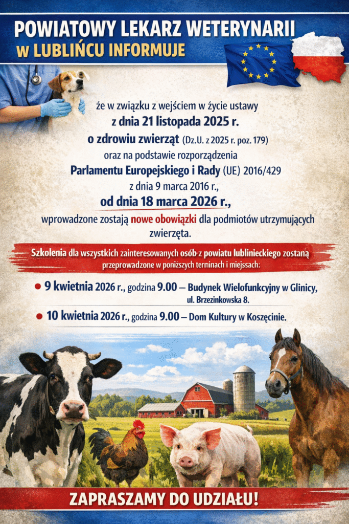 Powiatowy Lekarz Weterynarii w Lublińcu informuje, że w związku z wejściem w życie 18 marca 2026 r. ustawy z dnia 21 listopada 2025 r. o zdrowiu zwierząt w znaczącej większości uchylone zostały przepisy ustawy z dnia 11 marca 2004 r. o ochronie zdrowia zwierząt oraz zwalczaniu chorób zakaźnych zwierząt, a akty normatywne wydane na jej podstawie utraciły moc. Dotyczy to m.in. rozporządzeń regulujących kwestie prowadzenia działalności nadzorowanej przez organy Inspekcji Weterynaryjnej. Zgodnie z rozporządzeniem Parlamentu Europejskiego i Rady (UE) 2016/429 z dnia 9 marca 2016 r. w sprawie przenośnych chorób zwierząt oraz zmieniające i uchylające niektóre akty w dziedzinie zdrowia zwierząt („Prawo o zdrowiu zwierząt”) podmioty i zakłady dotychczas zarejestrowane lub zatwierdzone zgodnie z unijnymi regulacjami prawnymi uchylonymi przez to rozporządzenie uznane zostały co do zasady odpowiednio za zarejestrowane lub zatwierdzone zgodnie z nowym aktem prawnym. Niemniej jednak, z uwagi na potrzebę właściwego wykonania przepisów rozporządzenia 2016/429 w zakresie powiadamiania w celu: rejestracji podmiotów i zakładów oraz zatwierdzania zakładów prowadzących działalność na terytorium Polski konieczne było podjęcie działań zmierzających do uporządkowania powyższych kwestii. W tym celu w Ustawie o zdrowiu zwierząt wprowadzono regulacje (art. 142 – 144) nakładające na te podmioty jednorazowy obowiązek przekazania, w terminie 3 miesięcy od dnia wejścia w życie przedmiotowej ustawy, brakujących informacji, których obowiązek przekazania wynika z rozporządzenia 2016/429 oraz z przepisów Unii Europejskiej wydanych na jego podstawie.